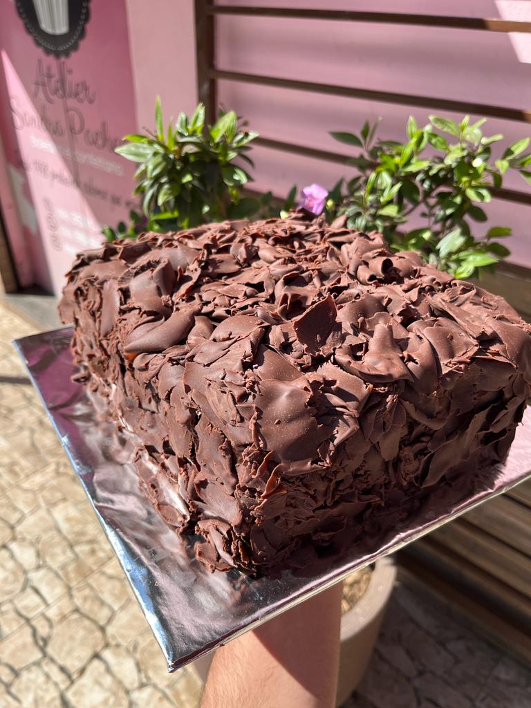 Massa de chocolate molhadinha recheada com três camadas de brigadeiro cremoso, cacau 50%.
