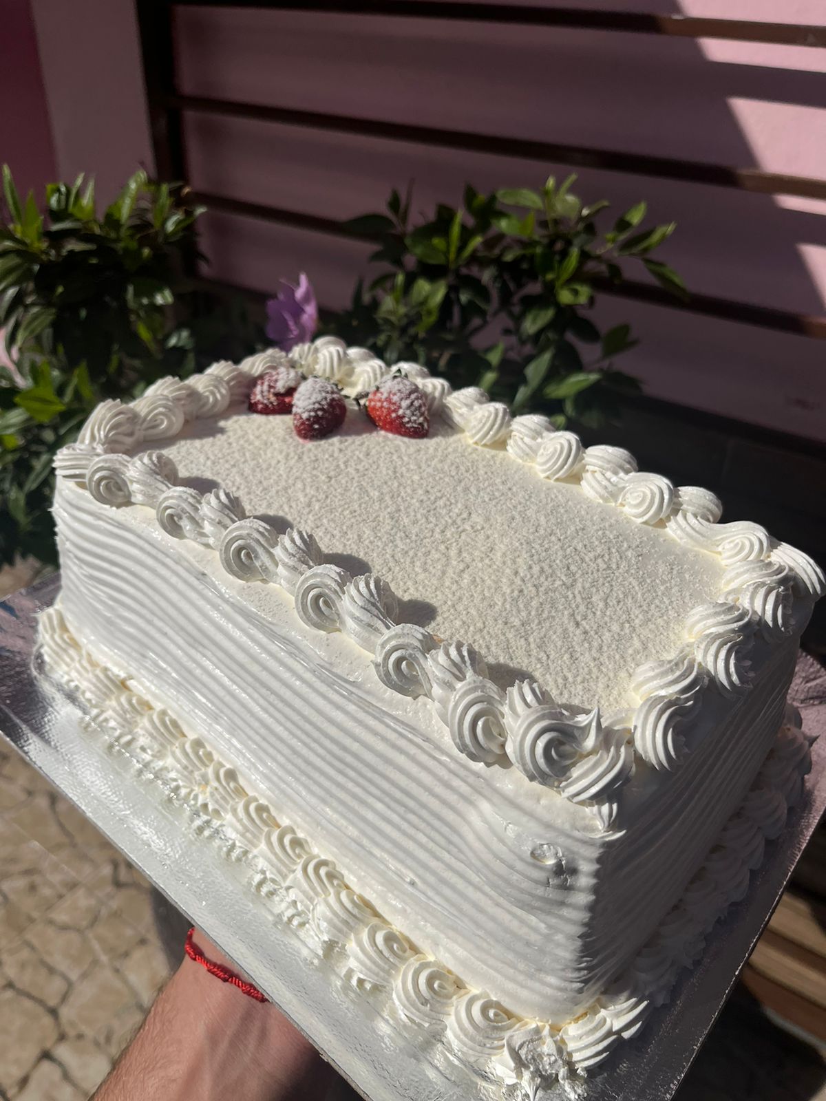 Massa branca molhadinha recheada com três camadas de ninho branco cremoso e morangos frescos em pedaços.