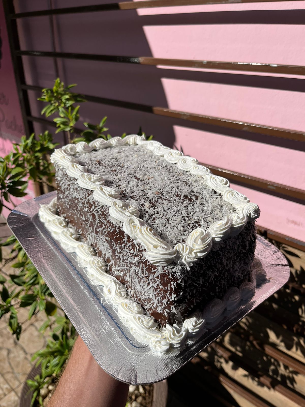 Massa de chocolate molhadinha recheada com três camadas de creme de coco.