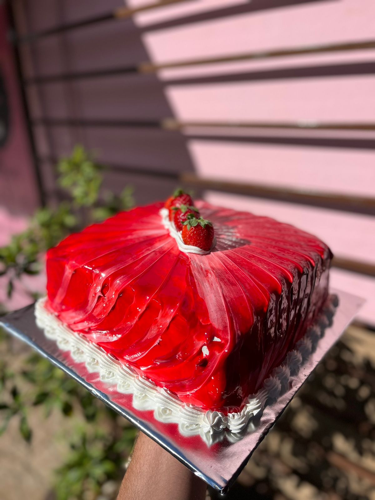 Massa branca molhadinha recheada com três camadas de creme de baunilha com morangos em pedaços.